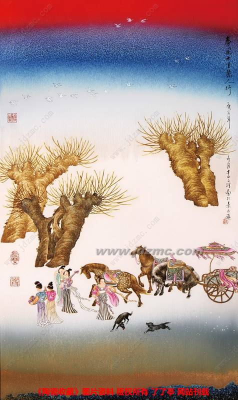 独创精神是唐代绘画的特色,院体画和文人画均于此期初兴,李文跃“西域风情”中表现唐诗画意的作品偏重于院体风格,设色华美,工整细致,由于融入现代工艺技法与理念,因而带有浓厚的“新院体”画风,颇有李思训父子金碧山水之气象。 “三月三日气象新,长安水边多丽人。”李文跃粉墨彩瓷板画《丽人行》即是其新院体画风的代表作品。《丽人行》诗篇是杜甫描写唐代长安贵族女子出行之景,李文跃将其场景移到塞外,丽人们华服游玩,或骑或乐,其意融融,形成一种强烈的时空穿越之感,别有一番情致。