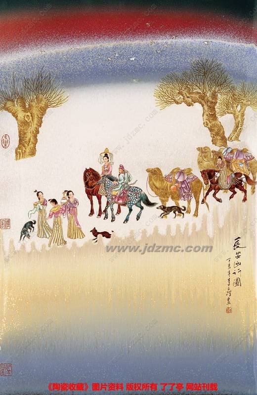 粉墨彩作品《一路欢歌》瓷瓶亦是其新疆少数民族风情的代表之作,采用色釉对环境简化处理,和繁复的人马相得益彰,在简与繁的对比中显示出颇具民族色彩的装饰美感。