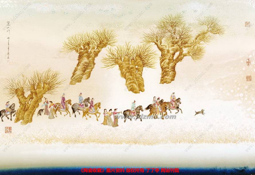 李文跃是当代陶瓷艺术界卓有影响和很有成就的艺术家,他凭借陈雨前博士盛赞为扛鼎之三巨作的粉墨彩《清代颐和园》、《曲阜三孔》和《清代景德镇窑盛景图》,已经牢固确立其在当代景德镇陶瓷艺术界地位,于不惑之年时已经将事业提升至如日中天。当人们正疑虑其是否已到达自身艺术域限之时,李文跃却已将创作的视野从具有极厚重历史文化积淀的主题创作题材中跳出,拓展到了茫茫戈壁、沙漠和绿洲,创作了一大批展现西部塞外风土人情中国气派的作品,称之为“西域风情”系列。然而,其笔下的西域既非大漠孤烟的苍凉,亦非万树梨花的萧杀,却分明带有一种浓郁的西域风采与江南的婉约诗境韵味,少了些金戈铁马的豪迈,多了些杨柳岸晓风月夜的意趣。以此观李文跃的西部风情系列,我们似乎可以将其称为西域婉约画派。几乎每画必具的胡杨成为大漠的标志,也成为非常李文跃的符号,将春风丽人、古风新韵拉入到西域,与粉墨彩的粉润沉静、颜色釉的瑰丽奇谲融合为一,形成一种至为奇妙的视觉感受,无论称之为西域画的江南派抑或珠山瓷画的西域派,于西域画领域与陶瓷绘画领域,都具有一种显著的开拓意义。