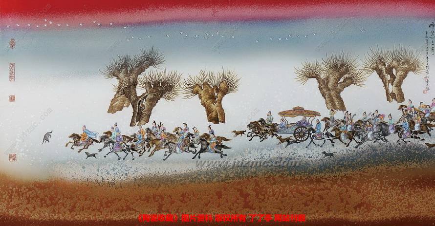 观李文跃粉墨彩作品《丝绸之路》瓷瓶即是如此。沙漠胡杨、戈壁骆驼,这些很西域的景象使人一望便知行进的驼队是在丝绸之路。上方结晶釉如飞天女神洒下的片片丝路花雨,与下方的色釉相配合,刹那间将壮美西域凝固成唯美的一瞬。如果说高温窑变色釉的工艺运用造就了作品的外在惊艳,那么人物形象的艺术表现则是作品的灵魂,形成了内在神韵,凸显着主题。二者的结合形成李文跃不可模仿的图式语言。人物驼队以其独创的粉墨彩绘制,骆驼平稳安祥前行,驮载的多是俏丽佳人,而从胡人装束的随从可知其为胡姬,李白曾有诗云:“胡姬貌如花,当垆笑春风。”以粉彩细致勾勒染色的胡姬弹吹着琵琶、长笛、箫等各种乐器,弦鼓并举,极具娇态。而走兽中墨彩技法的结合,则使画面顿生沉静之感。观此作品如历一次文化之旅和视觉盛宴。粉墨彩作品《西域风情》笔筒则与《丝绸之路》有异曲同工之妙。采用粉墨彩精细描绘的驼队且行且歌、一路欢快,下部则采用丰富而响亮的窑变花釉进行衬托,产生淋漓奇异的肌理效果,将丝绸之路表现得更具盛世气象,具有如敦煌壁画般的华美。