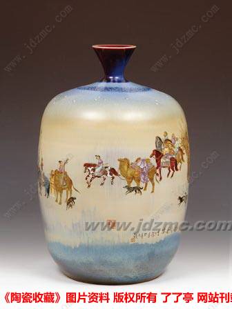 粉墨彩作品《文姬归汉》瓷板即是李文跃新文人塞外瓷画的代表之作。东汉才女蔡文姬陷胡归汉的故事广为流传,以此为蓝本所创各类绘画作品可谓众多,而该作品则以光怪陆离的窑变色釉营造塞外背景,凸现出瓷画的独特美感。在色釉铺陈开的壮丽画幅中,蔡文姬一马当先,意气风发,气宇轩昂并充满归汉的喜悦之情,而胡人则多显现出一种弓身退缩之态,从而更加突出了文姬的飒爽之姿。