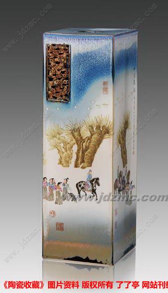 与《文姬归汉》相类似的作品是粉墨彩《昭君出塞》瓷瓶。不过与《文姬归汉》相比,作品显现出更多的人情味,昭君及其侍女与胡人们相伴而行,昭君驻而回望,并无伤感之态,画面笼罩着和谐平安的氛围。由这两幅作品在立意上的巧妙处理,可知李文跃对这类历史典故主题营造的独具匠心,是在熟谙故事之后的精心布置。新文人色彩更为鲜明的是粉墨彩瓷板画作品《三人行必有我师》。典故出自《论语·述而》:“子曰:‘三人行,必有我师焉,择其善者而从之,其不善者而改之。’”李文跃别出机杼地将孔子与众弟子出游的地点选于塞外,以衬托出儒家学者修为之道的艰辛。画面中,孔子与两位弟子谈经论道,身旁的牛车与其身后众弟子所驾马车形成鲜明对比,更显现孔子淡泊清高之谦恭品格。