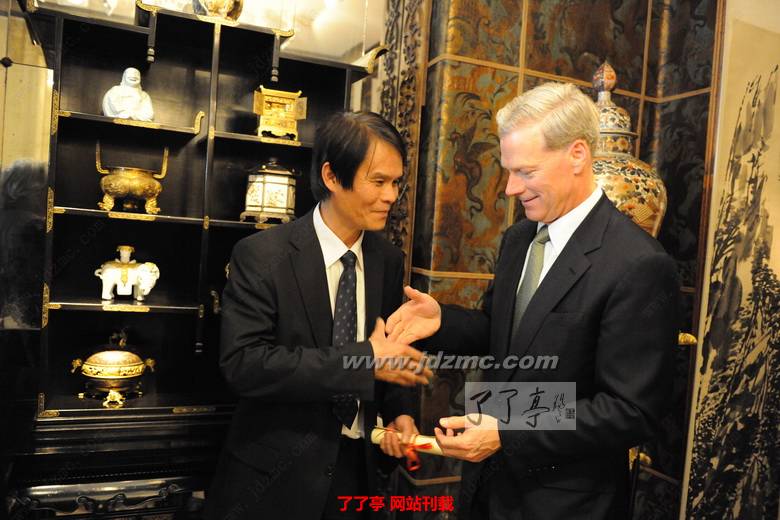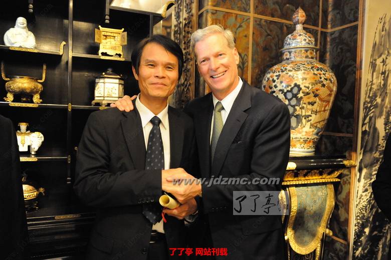 2013年6月17日美国洛克菲勒家族第五代掌门人史蒂文.洛克菲勒为宁勤征颁发收藏证书后亲切合影留念
