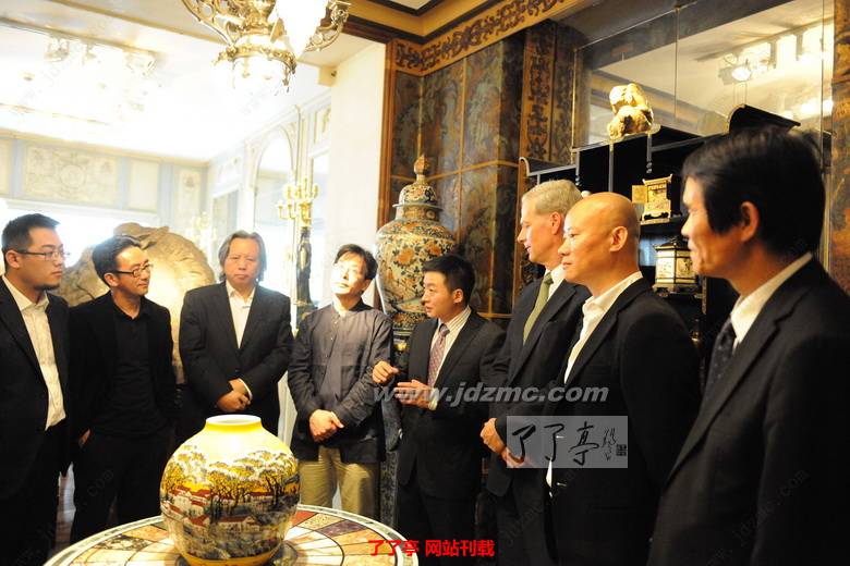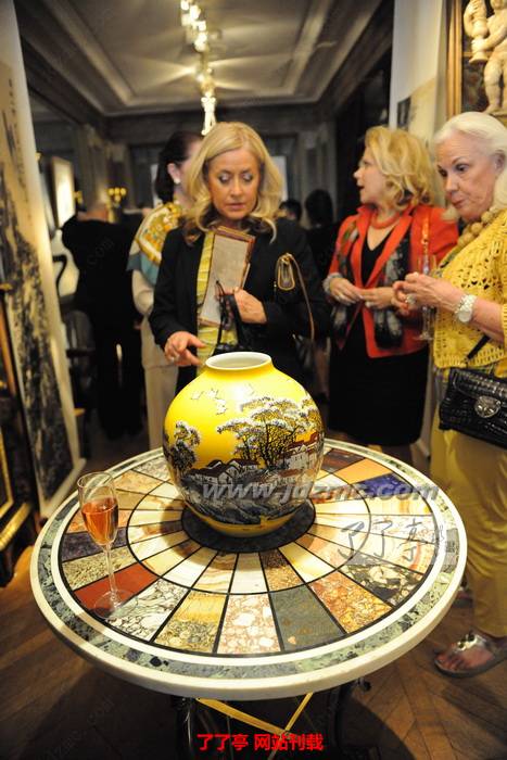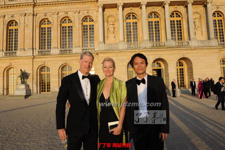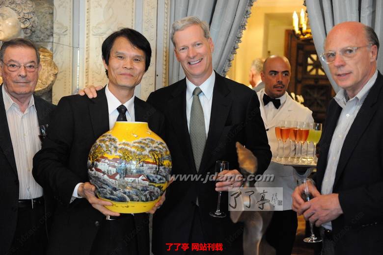2013年6月17日宁勤征创作的高温皇家黄颜色釉堆画装饰山水《秋如醉》作品在凡尔赛宫展出时与史蒂文.洛克菲勒先生及法国政要和收藏家合影