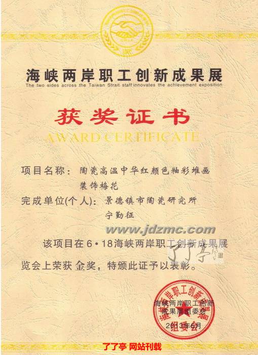 1.2013.6.18获海峡两岸职工创新成果展金奖2013.6.22建