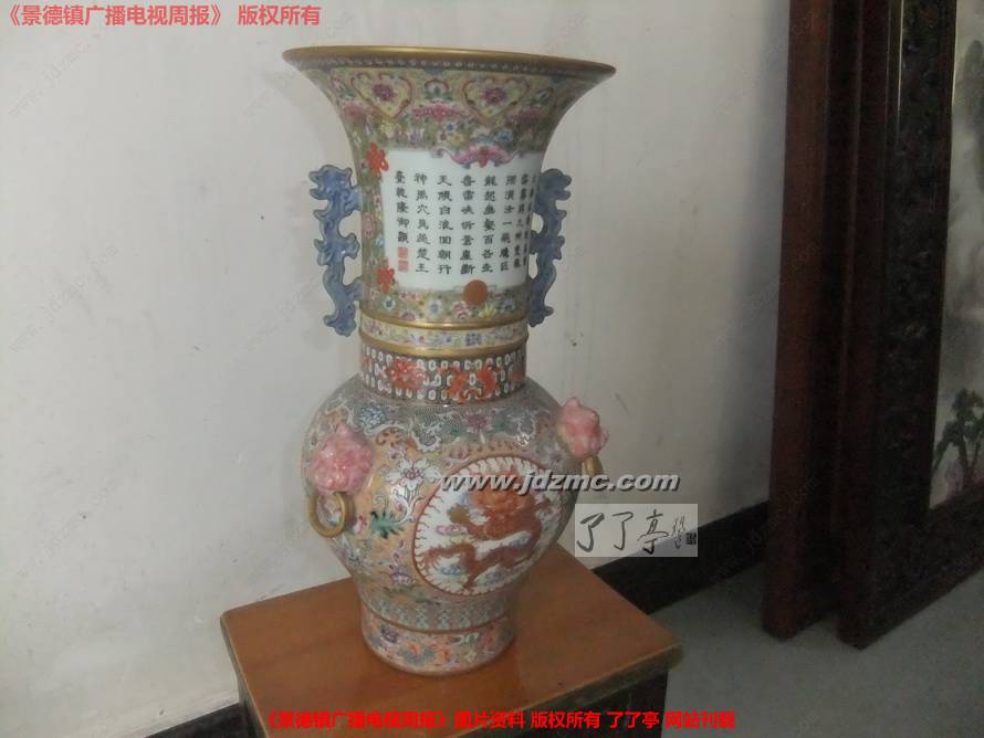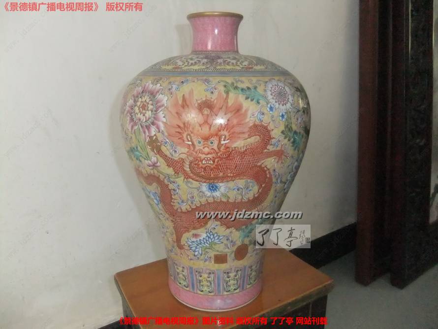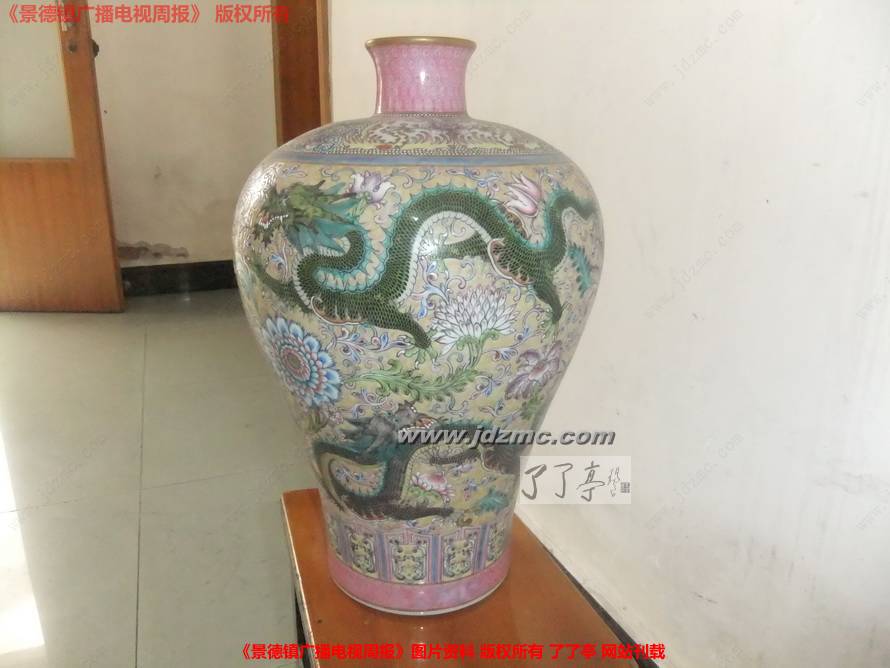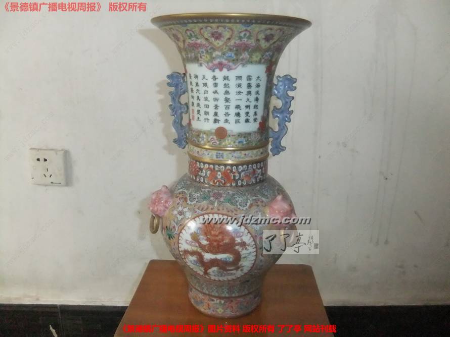 余劲松认为:好的作品就是孤品、绝品,是不能复制的永久的经典。此件《九五之尊》作品是150件吉祥图案冬瓜瓶,它上面颈口用龟景重工结果装饰,瓶颈有“福禄寿”三多图案,寓意多子、多福、多寿。里面用传统“万字颈”镶嵌而成。瓶肩采用五凤穿万花,由赤金描绘而成。瓶的主题就是“九龙”,九龙穿花,由西蕃洋莲穿插,显示出富丽堂皇、气宇轩然的皇家气派。底色之上由凤尾草镶嵌而成,也就是在颜色上面再次结果,这种重彩装饰烧成风险很大,但最终这件作品还是以其完美无瑕展现在世人面前。这是余劲松一辈子的心血之作,这件作品对他来说已经不可复制。毫不夸张地说,这件作品从传统文化着手,以中国传统龙凤图案为设计亮点,运用现代陶瓷各种工艺表现手法,民族特色和原创成为这件作品真正的生命力和原动力,在传统古典陶瓷艺术史上也属于一件传世之作、稀世珍品。