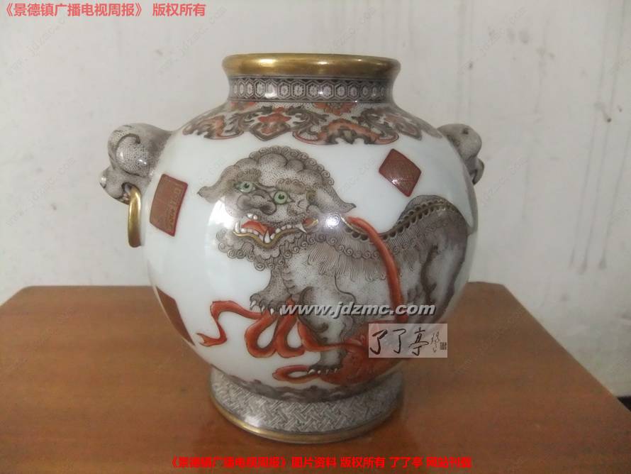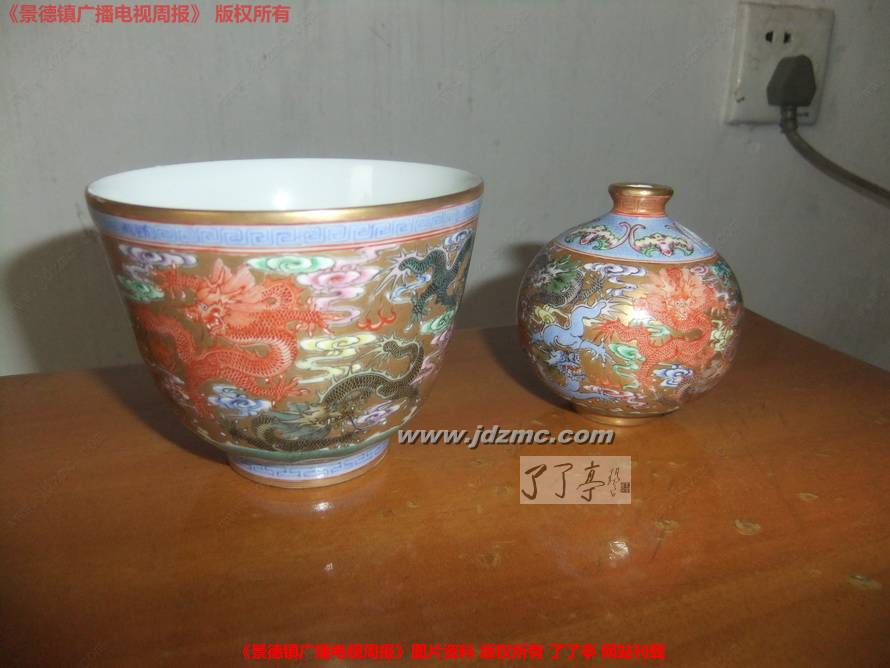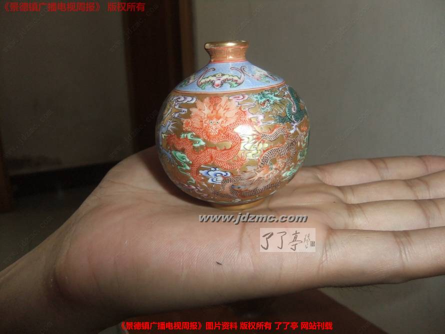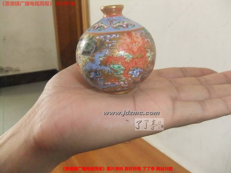 90年代,余劲松和妻子画的都是小件作品,尤其是鼻烟壶画得多。这些作品大多小不盈寸,但余劲松能够在这方寸之地画九龙、龙凤、九狮等吉祥图案。中国是个龙的国度,中华民族为龙的传人,龙代表了民族的崇高和吉祥的象征。传统绘画的龙是“见首不见尾”,但余劲松画的龙,龙首、龙身、龙爪、龙尾等等,肢体齐全,在赢寸的空间内可以画九条龙,用陶瓷粉彩手法表现出立体效果,龙精细处的绘画近似微雕。这在景德镇被行业内称之为“余氏一绝”。