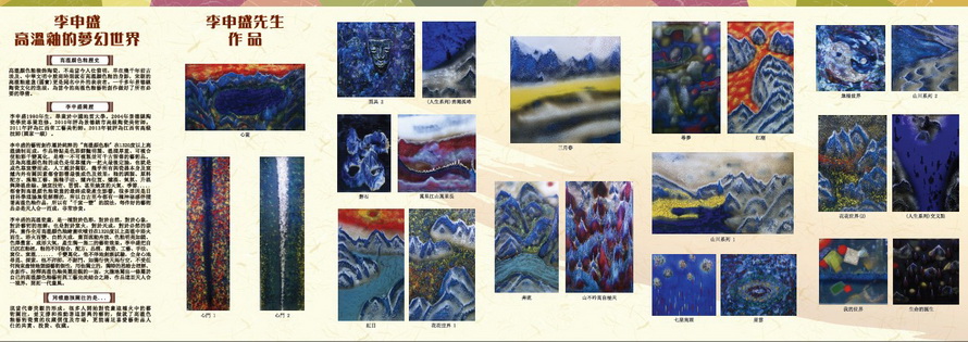 李申盛的高溫瓷晝,是一種對於色彩,對於自然,對於心象,對於藝術的理解:也是對於窯火,對於天成,對於必然的崇拜,晝作全用高溫顏色釉繪畫吹噴並在1320度以上高溫中浴火而生、浴火而變自然天成,晝面流動卉放、色釉明亮如鏡、色澤豐富、成形大氣,產生獨一無二的藝術效果。李申盛把自己沉在釉裡,釉的不同複合配方、品種、數量、工藝、手法、窯位、窯溫……,千變萬化,他不停地創新試驗,全身心地尋覓、探索,他不拜師,不歸門,如獨行俠天馬行空,不受任何拘束盡情地張揚藝術個性,用他獨立的,獨特的思維去理解、去創作、詮釋高溫色釉美麗壯觀的一面,大膽地闖出一條屬於自己的高溫顏色釉藝術與工藝完美結合之路,作品達至天人合一境界,開拓一代晝風。