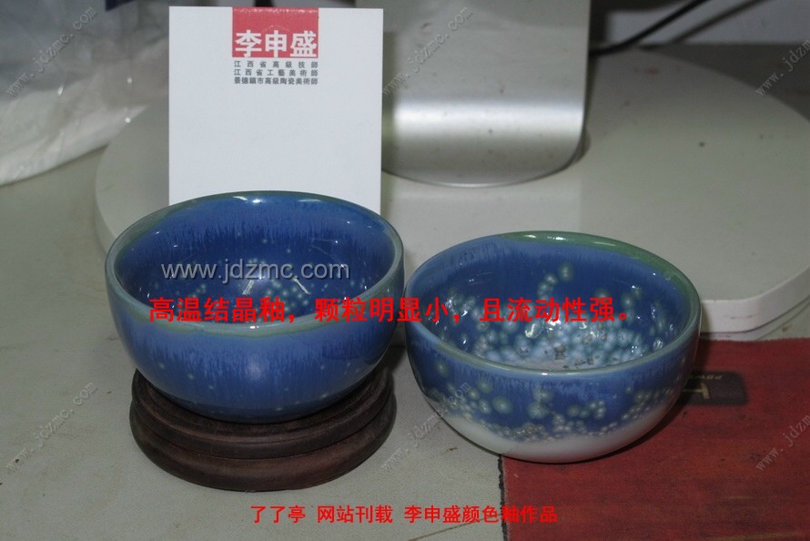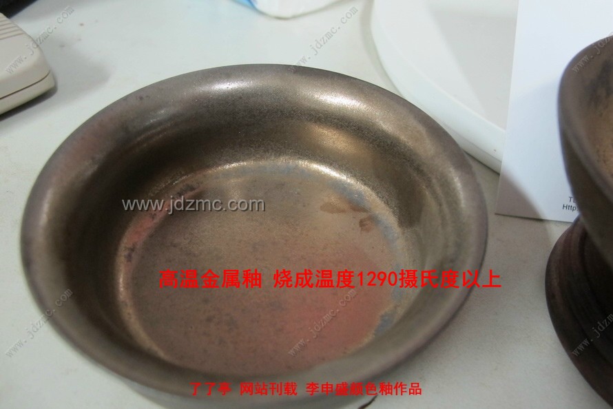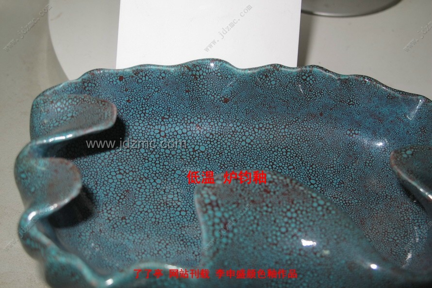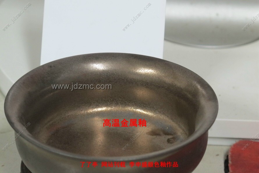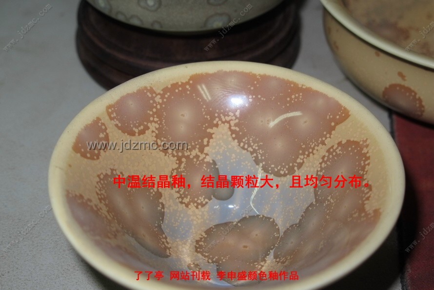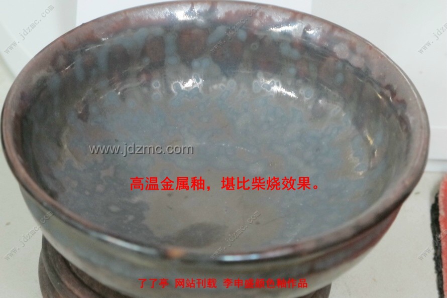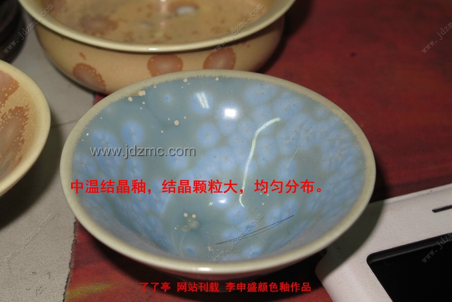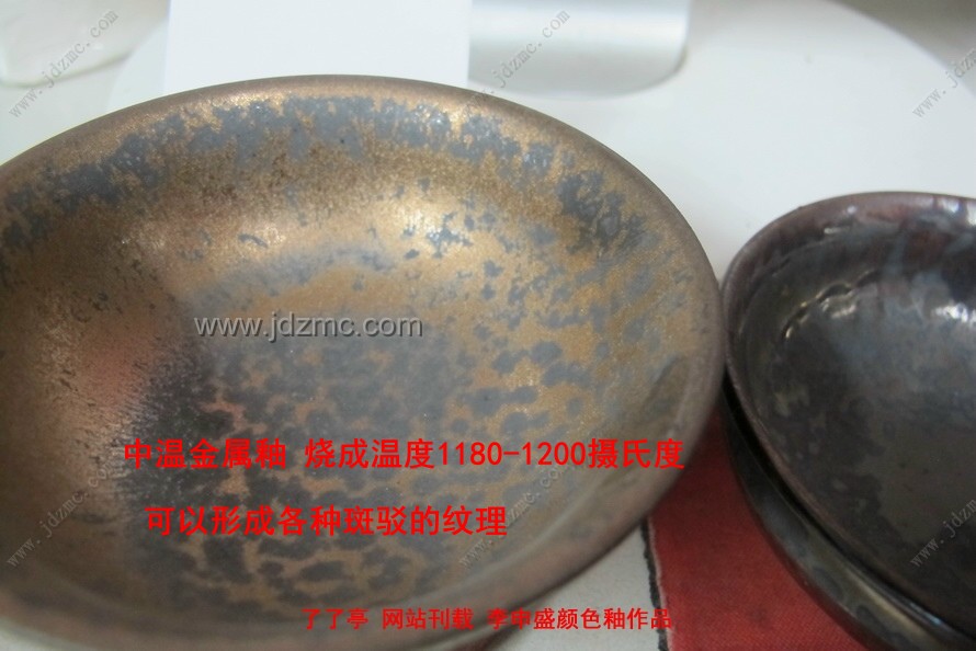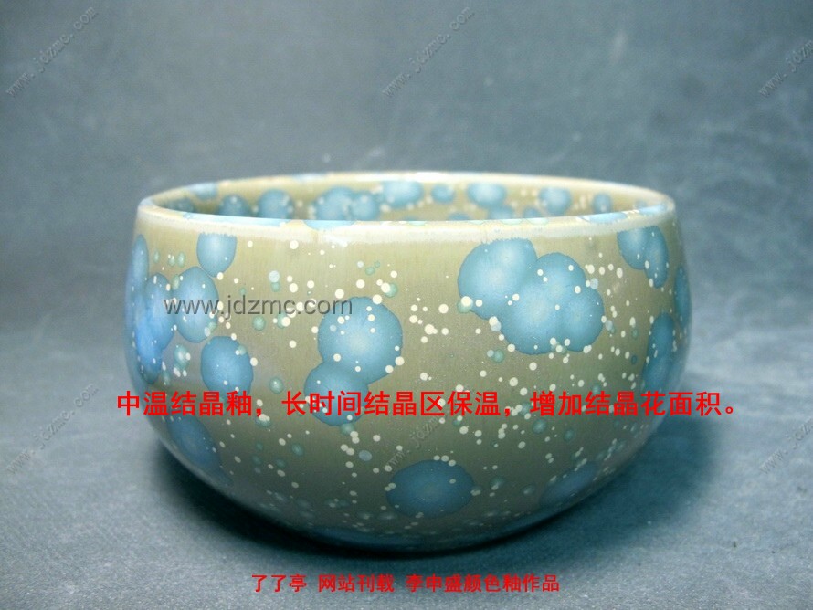第二个就是中温釉,中温釉大多是氧化焰烧制,氧化焰多是电窑烧制,容易控制温度曲线对于结晶等特殊效果,可以起到很大的辅助作用,您不是常常在瓶子上面看到那种很大很多的结晶花吗?那就是中温烧制的,给予若干个结晶核,在特定温区长时间保温,让结晶核不停的长大,最终可以形成不同大小的结晶花。景德镇的中温釉由1160摄氏度-1220摄氏度氧化焰为主,上下都有些出入,看个人对于釉烧成的需求而具体操作。这个中温釉里面主要是结晶釉占去绝大多数,另外还有各种金属釉,虽然高温釉里面也有大量的金属釉,可是和中温釉中的金属釉比,中温金属釉的质感,变化效果往往很多,而且常有一些很特殊离奇的效果,反过来看高温金属釉效果单一,鲜见到很离奇的纹理出现。这个里面原因我(李申盛)分析如下,中温金属釉因为配比的需要和烧制温度需求大多不太流动,因为不流动的特性容易通过使用施釉手法,浓度变化,温度调整,釉中物质相互融合排异而产生诸多离奇的效果。而高温金属釉大多无法控制其在高温状态的流动性,绝大多数的高温金属釉在高温效果下,都产生较强,或者很强的流动性,其他的反应无法进行停留和原地反应,大多给带走流淌到器型底部位置,再好的效果也难以做出来了。