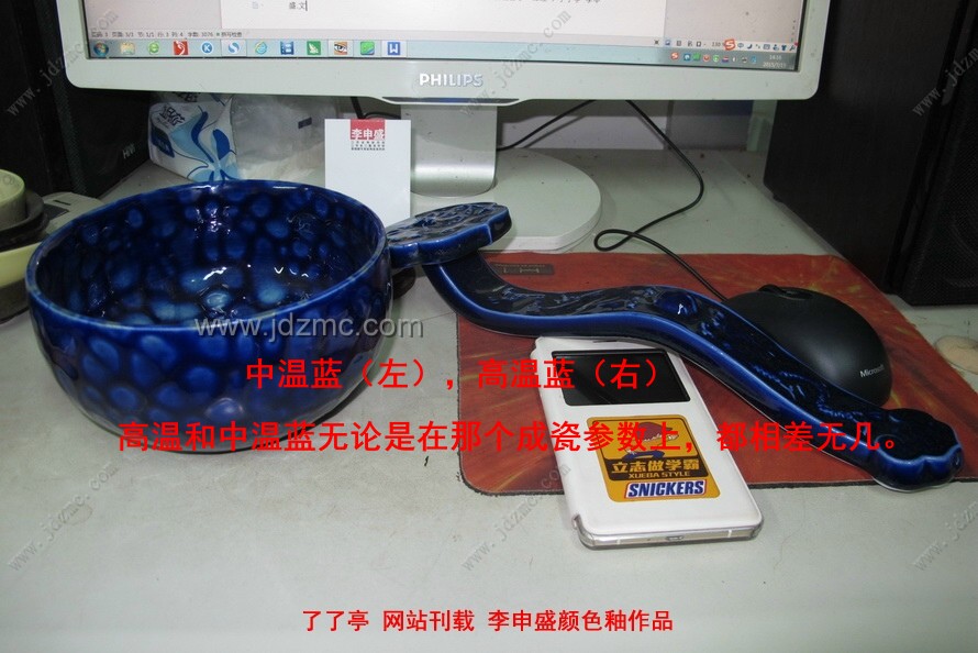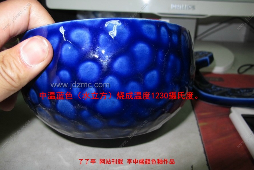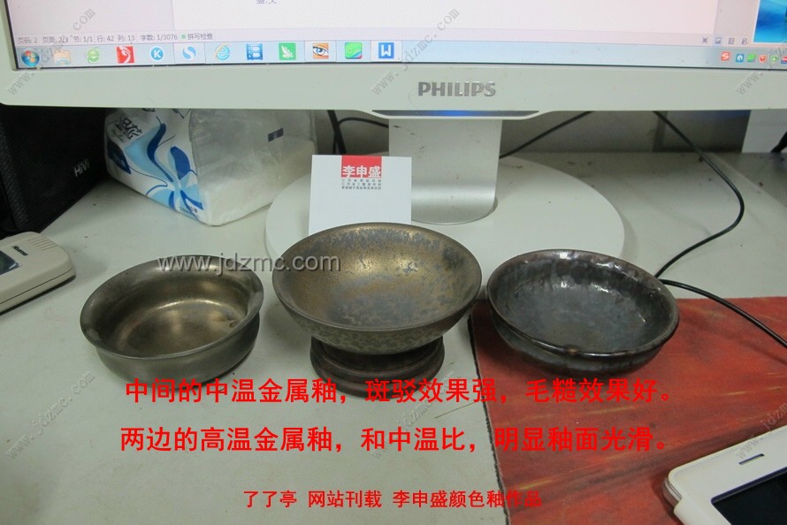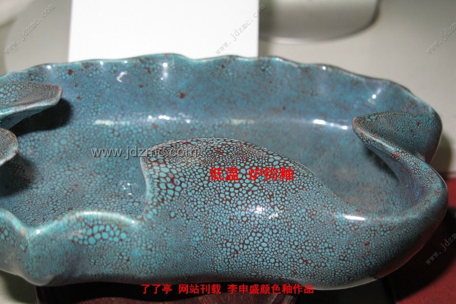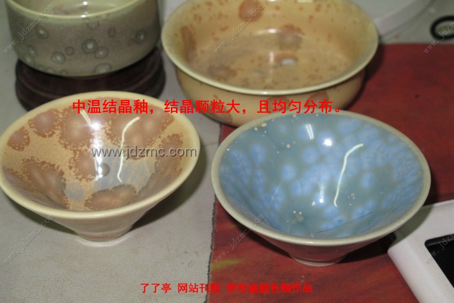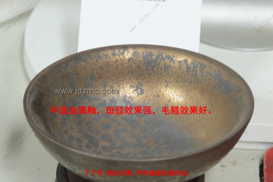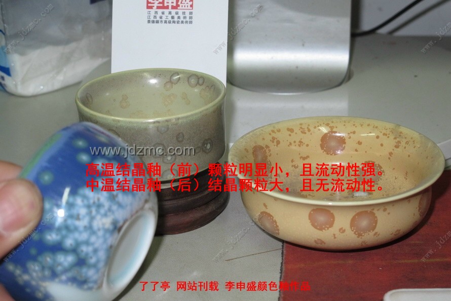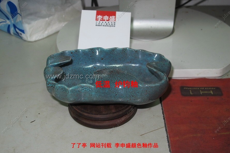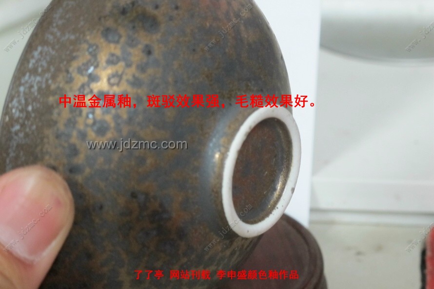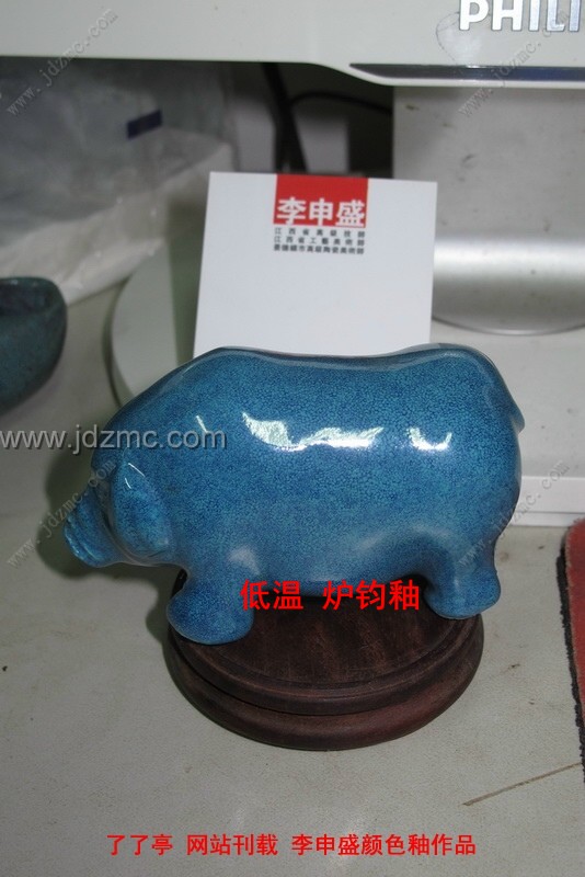 第二个就是中温釉,中温釉大多是氧化焰烧制,氧化焰多是电窑烧制,容易控制温度曲线对于结晶等特殊效果,可以起到很大的辅助作用,您不是常常在瓶子上面看到那种很大很多的结晶花吗?那就是中温烧制的,给予若干个结晶核,在特定温区长时间保温,让结晶核不停的长大,最终可以形成不同大小的结晶花。景德镇的中温釉由1160摄氏度-1220摄氏度氧化焰为主,上下都有些出入,看个人对于釉烧成的需求而具体操作。这个中温釉里面主要是结晶釉占去绝大多数,另外还有各种金属釉,虽然高温釉里面也有大量的金属釉,可是和中温釉中的金属釉比,中温金属釉的质感,变化效果往往很多,而且常有一些很特殊离奇的效果,反过来看高温金属釉效果单一,鲜见到很离奇的纹理出现。这个里面原因我(李申盛)分析如下,中温金属釉因为配比的需要和烧制温度需求大多不太流动,因为不流动的特性容易通过使用施釉手法,浓度变化,温度调整,釉中物质相互融合排异而产生诸多离奇的效果。而高温金属釉大多无法控制其在高温状态的流动性,绝大多数的高温金属釉在高温效果下,都产生较强,或者很强的流动性,其他的反应无法进行停留和原地反应,大多给带走流淌到器型底部位置,再好的效果也难以做出来了。