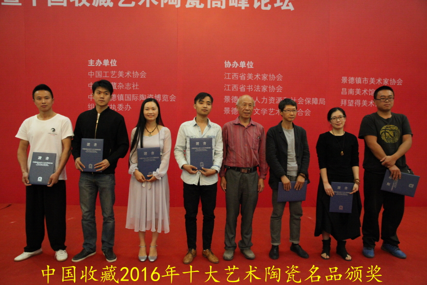 了了亭和窦衍英相识,缘于中国收藏杂志社及中国景德镇国际陶瓷博览会执行委员会共同主办的景德镇“中国收藏2016年十大艺术陶瓷名品”颁奖大会上,李申盛和窦衍英的作品,经多位国家级权威专家严格评审,同时被推举为“中国收藏2016年十大艺术陶瓷名品评选银奖.最佳创意奖”。