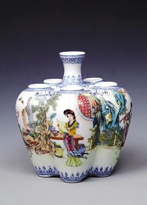 近两年,现当代艺术瓷市场售价逐年翻番,尤其是名人名作的价格以几何级数递增。京、沪、浙、港、台地区及新加坡等地的收藏家对景德镇现当代陶瓷保持了多年的关注和收集,却极少在市面上出手,随着国内现代艺术瓷市场的高速发展,藏家们加快了对精品力作的收藏。其中一批已故的陶瓷美术家的作品已成为“绝响”,更是他们出高价追逐的目标。如1959年被评为“陶瓷美术家”的赵惠民,一个高33厘米左右100件的瓷瓶,在2000年市场价仅为1万元左右,到了2004年一件同样大小的作品市价为10万元左右,2007年一件高20厘米左右80件的六管瓶(见图),香港的一位收藏家愿出30万元收购,而藏家却不愿转让。