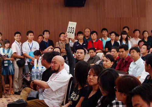 10月20日下午3时30分,在上海崇源艺术品拍卖有限公司(以下简称崇源公司)拍卖师的主持下,2008年首届景德镇国际艺术陶瓷拍卖会在紫品宾馆举行。由于闻讯赶来的买家人数远超主办方的想象,因此保安不得不礼貌地婉拒记者、普通市民等非参拍人员进入拍卖会现场的要求。