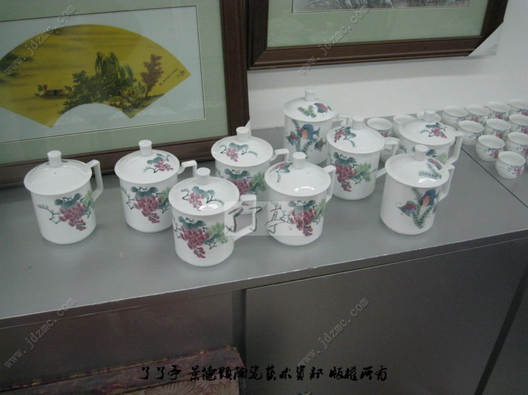 这是一套组合型的瓷器,釉下彩画釉中彩的味道,是请一位年轻的画师完成的。其中的画面、器形都是亲自挑选。茶杯(老板杯)是在一个窑口制作和烧造,茶具是在另外一个窑口烧制。因为是分别进行制作,两边跑。最后全部出窑的第一时间我没有去,因为怕出问题,这种瓷器是要烧两道的,出问题的比率很高,如果问题比率过高了,这10%的跑腿费我都要搭上,因为我觉得不应该让画师受损失。