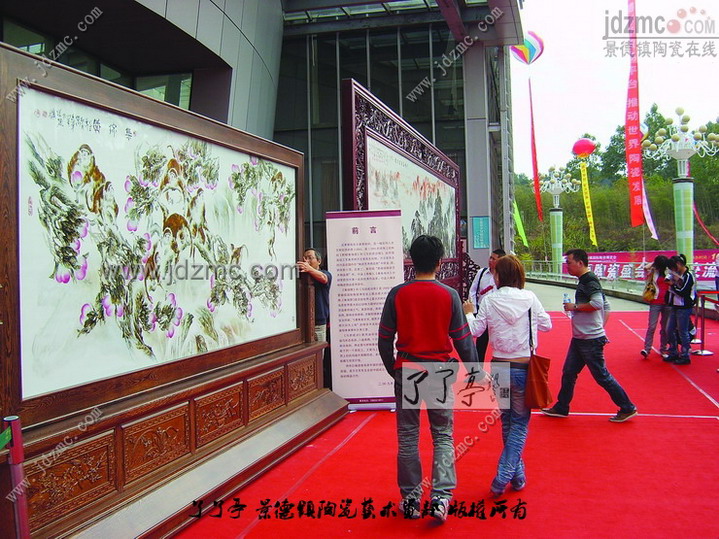 在展厅的入口处,作为新中国六十周年献礼作品,几幅瓷板画是瓷博会上当之无愧的庞然大物。画有灵猴、飞瀑、仙桃的《群猴集瑞图》是目前世界上最大的粉彩瓷板画,也是世界最大的以动物为题材的粉彩画。它与陈列在旁边的《马到成功图》共同分享2009瓷博会展出的最大单瓷板画桂冠,同时这两幅作品也列入吉尼斯纪录。另一边,全长42米的《西江揽胜图》全景展现了江西的壮丽风貌,该作品已经申报吉尼斯世界纪录。