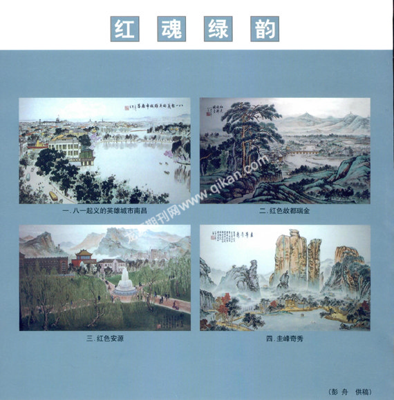 “八一起义的英雄城市南昌”瓷板画以绿树成荫、水光潋滟的百花洲为近景,轻烟袅袅的新厂房和云烟缥渺的梅岭为远景,高竖飘扬红旗的“江西大旅社”赫然耸立一旁。这座灰色的五层大楼是八一南昌起义总指挥部旧址,在这里,1927年8月1日以周恩来为书记的中共前敌委员会领导了著名的八一起义,打响了武装反抗国民党反动派的第一枪,开创了中国共产党独立领导武装斗争和创建人民军队的新纪元。江泽民同志在此题词:“军旗升起的地方”。百花洲是八一起义中革命军队与国民党军队激战的重要场所(封底,图一)。