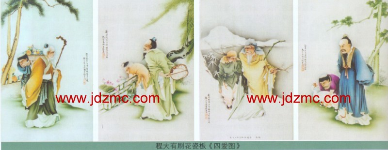 我曾经有幸去拜访资深陶瓷美术家、中国工艺美术大师王锡良老先生。采访中,王锡良大师讲到民国陶瓷刷花艺术瓷时,特别提到了当时的陶瓷刷花家程大有,他说: “早年,已故刷花名家陈先水先生,曾带我到过程大有家,看到了程大有的人物刷花瓷板画,刷得非常好,技法娴熟,格调高雅,作品既有国画特点,又有陶瓷艺术独特的装饰效果,如果梅建鹰教授能看到程大有的作品,我看也一定会喜欢。”程大有作为民国时期陶瓷刷花艺术的杰出代表,他的作品时人争相购藏。大多被博物馆与海内外收藏家珍藏,景德镇陶瓷馆现藏有他的“渊明爱菊”、“茂叔爱莲”、“和靖爱梅”、“羲之爱鹅”,四块刷花人物瓷板(见上图)。程大有英年早逝,民间流传他的作品甚少,所以现在他的作品弥足珍贵,一般人难得见到。故70岁以下的人大多不知道程大有其名。