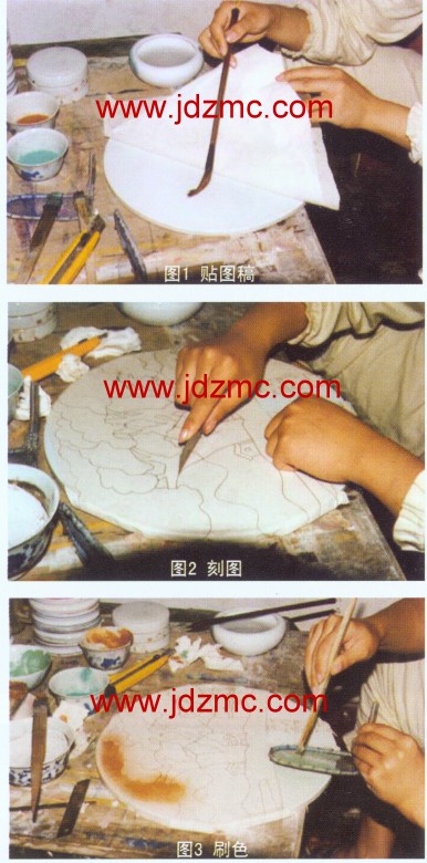 刷花是景德镇传统的陶瓷手工彩绘,是釉上彩中新彩的品种之一:刷花的工具,是用笔刷、小刀笔、小铁钳、画笔和铜丝制成的小筛。操作过程(见图1、2、3)是:先将瓷面以陶瓷胶和水适量配合,糊上事先按瓷形设计好的专用图纸,干后,用小刀笔依照图样刻出花纹图案,然后陆续剔去有纹样的地方。这样,瓷面上呈现出空白的花纹来,再用笔刷蘸着所有要表现的各种新彩颜料,隔着铜丝网筛来刷,细小的颜色粉末就会附着在瓷面上,根据需要达到浓淡、深浅的变化,最后,在颜色面上用颜色面上用料画笔勾线调整,称之为“结果”。经700到800度“红炉”彩烧就形成了色彩明丽柔软的刷花瓷。刷花技术的形成与发展,大体是和洋彩(新彩)同步成略晚一点,在晚清时期。景德镇的陶瓷彩绘艺术。当时受西方的搪瓷喷花与西画的启发影响不断探索遂步完善形成发展的,不是某个人的发明创造。在手工刷花技艺的发展过程中,民间时期最为鼎盛。程大有是这个时期的代表,当时有“刷花大王”之誉。
