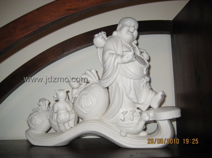 最后我买了这个,象牙瓷的,达瑞非常喜欢,我也是。这个弥勒笑相极佳,不是别的那些那么机械生涩的笑。他脚踏长寿龟和玉如意,背后背着宝仙葫芦,右手托一锭金元宝,俗得可爱。后面的三个小人儿,每个额头上都有一颗圆圆的朱砂痣,每个手指甲、脚趾甲都清晰可见,我用放大镜看了,做工非常精细。尺寸大约60公分。名字叫袋袋福。