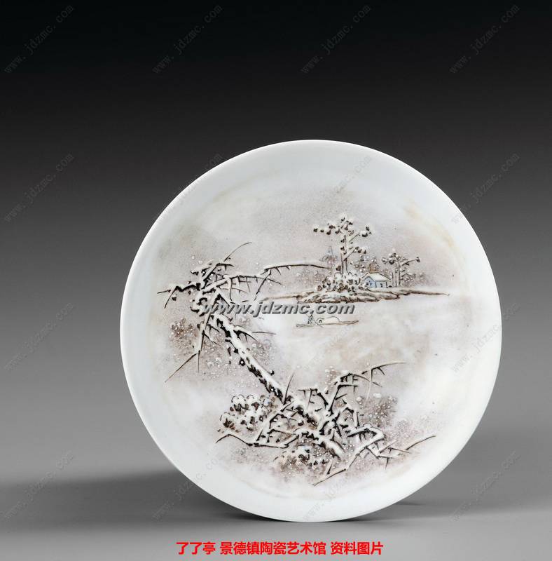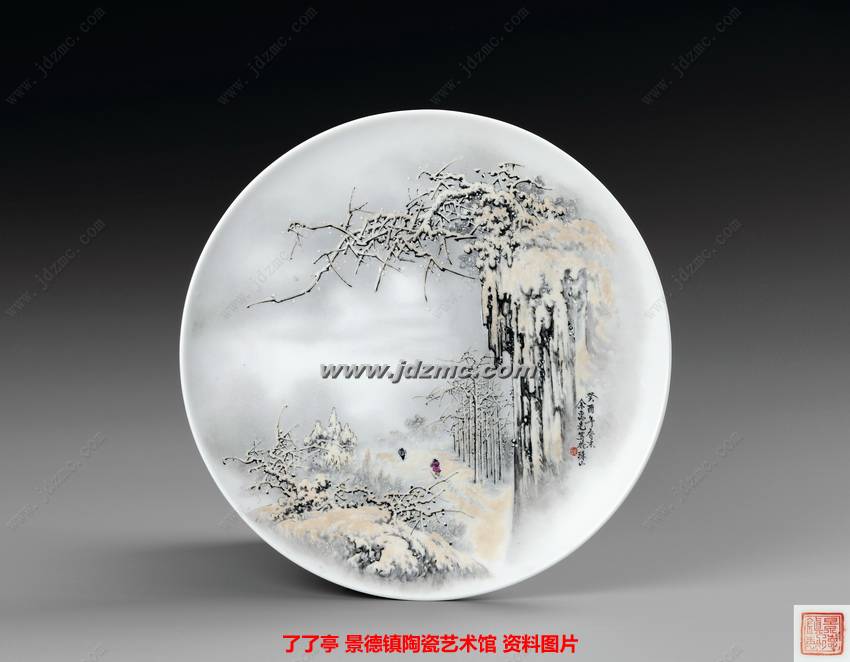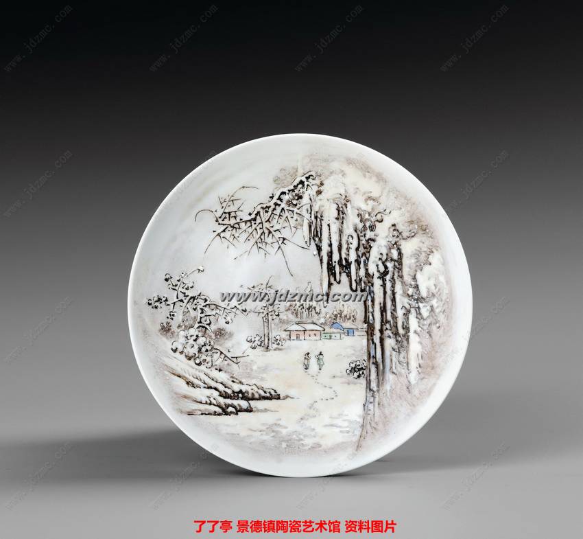 粉彩雪景是景德镇陶瓷近代历史上一个崭新的高度,它为前人所没有,自然也不会被前人所左右,经过近代短暂数代景德镇陶瓷艺术家的继承与发展,雪景也逐步形成了两个发展方向。其一为工笔雪景,连续布景,处处有景,在作品上,以满,细,工笔为特点,带给观者以视觉安逸的享受,所以很多收藏者称之为南方的雪。另外一种以造势为主,画面飘逸轻巧而不失雪景的凝重厚实。在你的眼球注视的重点,往往是一颗孤寂的大树,往往是一排挂满冰雪的围墙,往往是一堵参天的悬崖,它所带来的视觉是一种冲击力,是一种压迫感,这是田园式,宫廷式的风景雪景画面所不具备的。我个人倾向于后者,倾向于这种让人惊心动魄的构图与画面。