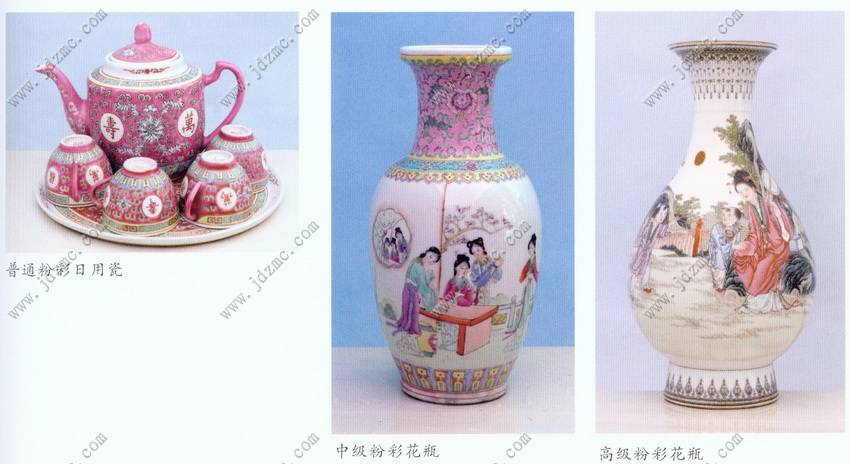 粉彩瓷绘装饰的手法很丰富,艺术表现形式有各种不同的风格、瓷品又有大小高低精细之分。用粉彩技法装饰的瓷品,大致可分成三个档次,即普通粉彩、中级粉彩和高级粉彩。普通粉彩通常都称作“大路货”,被广泛应用于粉彩瓷餐具、茶具等一些日用瓷的装饰,装饰方法较为单调、简易,普遍应用图案纹饰来布满画面,如“洋莲”、“万寿无疆”等,画面喜气洋洋,很迎合我国广大人民和东南亚各国人民“吉祥如意”的风俗习惯,在东南亚各国非常畅销。中级粉彩和高级粉彩大多是陈设艺术瓷,如瓶、缸、盘、钵、皮灯、瓷板、壁画以及文具等,亦有少量日用瓷,如餐具、杯碟之类。各个系列中、高级粉彩瓷,种类繁多,规格齐全,大的有2米多高的万件花瓶,长逾百米鸿篇巨制的壁画,小的有不及一指的单件花瓶、鼻烟壶。像薄如蝉翼、通体剔透的薄胎瓷和按样复制,可以乱真的仿古瓷,以及指定题材内容器型绘制的国家礼品用瓷等。这类高档粉彩。通常又称特艺瓷,是粉彩艺术瓷宝库中的精品佳作,艺术瓷厂创作,生产的粉彩瓷远销世界一百多个国家和地区,为促进我国与世界各国人民的友谊和文化交流作出了贡献。同时为扩大我国对外贸易,发展社会主义经济贡献了力量。