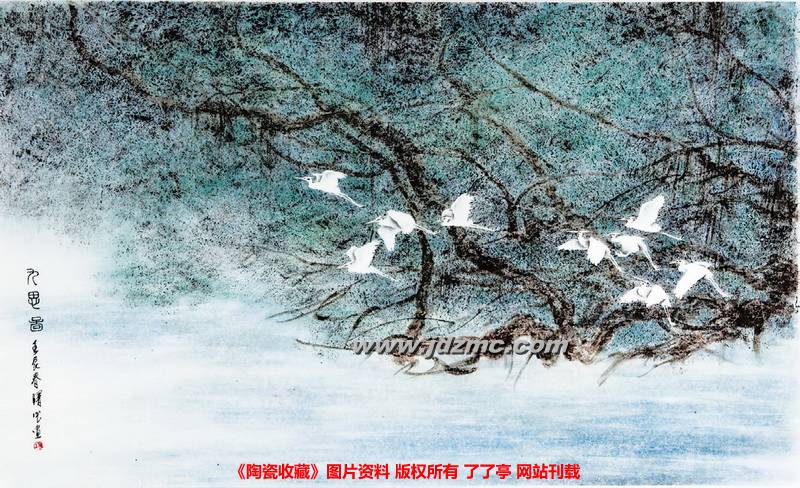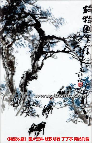 我们现在所介绍的是国家知识产权局授予了发明专利的水墨陶瓷画,它从工艺手法到艺术效果,均与中国文人画紧紧相扣。它有直接法和间接法两种方式,前者是先在瓷胎上植上动植物纤维或纤维制品,使瓷面形成纤维覆盖层,然后,用胶水调合特制陶瓷颜料在纤维层上作画,画毕入窑炉烧制成陶瓷绘画作品;后者是先将丝绢、薄宣纸等纤维制品加工成水墨陶瓷画专用纤化纸,用陶瓷颜料在纤化纸上完成绘画作品后,再将原件烧制在陶瓷上。无论直接法还是间接法,它都不是直接落笔于瓷胎上,而是着墨于有机纤维之上,它与中国画的承载体完全相同,所以创作程序、作画方式与技能技巧,都与中国画保持一致,不仅行笔畅快,而且颜料都吸附在纤维层里,画第二遍颜色时,不会将前遍色料大量翻起而污损画面,在同一位置,可以重叠加色,反复渲染,勾、皴、点、染、堆、擦、泼、洗等手法,均可随意为之,并且保持层层清晰,笔笔明快,画面上枯、焦、浓、淡、鲜、灰、艳、雅等墨色效果,皆可一纸同存。