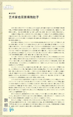 会有不少“美”泯灭在“铜臭”之中,而如果这位艺术家死守艺术气节,一味苦守自己的这个理念,直达入不敷出的地步,那么就连他自己也会怀疑,这是否是在一条没有没有光明的路上摸索。而这个问题,似乎在中国的“中庸之道”中有恰当的答案。对于自己的艺术理念,固然需要坚持,但是对于顺应市场做出变化,同样勿需嗤之以鼻。其实在艺术家看来,大可将顺应市场的作品看成商品,用这部分作品所得的汇报来作为自己艺术追求的基础,将自己的艺术理念发扬光大。因为只有填饱了肚子,才有力气去创作,这个 道理再简单不过了。