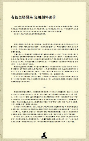 2006 年初,有色金属国际期货市场价格连续攀升,尤其是黄金、铜、锌、铝、铅等价格暴涨,直接波及陶瓷生产所需要的颜料价格,但却又不能撼动静如止水的陶瓷成品价格。这一市场现象所产生的连锁反映是:陶瓷生产者们在巨大的成本压力下,无奈地“节约”应对,深感疲惫。