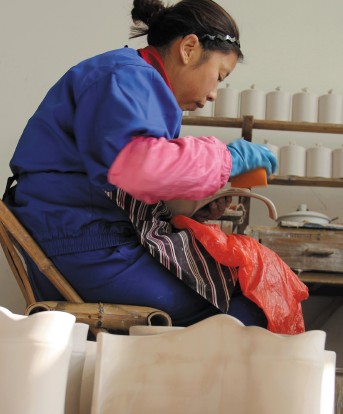 10 年前,程金令曾凭着雄厚的技术实力和优秀的管理水平,获得了全省劳动模范。现在,他只能和很多人一样,靠替私人作坊烧“点工”窑挣些钱接济一家三口。这种“点工”窑在景德镇的行业标准就是烧一窑30 元钱左右,业务量都没个准,要看私人老板的生意情况而或有或无。程金令一个月烧得最多时也没突破过10 窑,从16 号烧了这个月的第四窑到现在,程金令便一直没接到业务,整天呆在家里看着电视。尽管程金令显得有点闲,但面对采访时,仍然一口都昌腔地在电话中再三推辞,“都是过去了的事,没什么值得再提的。”