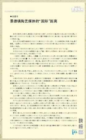 在这个时候,需要政府从世界艺术之都、国际艺术名都的宏观角度上,从资金、人力、政策等方面去扶持重点艺 术媒体,鼓励其兼并重组、做大做强。陶艺媒体也要从自身出发,树立“打造权威、塑造名牌”的长期发展战略。打造权威名牌艺术媒体,首先必须确保报道内容是公正、客观和真实的,是去除了狭隘的政治偏见和功利的、准确的报道,这样的内容才能在更大的市场上通行。其次,权威性、名牌性还反映在具有独家意见、独家视点,这些视点必须是科学的,经得起检验和推敲的,而且在未来市场验证中,越发显示其不一般的独特品质。在这场陶艺媒体传播整合过程中,每一位景德镇媒体人都有责任和义务,立足瓷都、放眼世界、精心策划、打造名牌,为促进景德镇艺术陶瓷的繁荣和发展作出新的贡献! 。《瓷海观澜》pdf文件网址:http://www.jdzmc.com/taocipinglun/