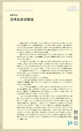 其三、对其功能进行开发利用。中国陶瓷博物馆的现状,可能是发展过程中出现的新情况,是过去的设计与现实有点脱离,难以做到、做好。现在不能局限于原来的设计方案不变,应当与时俱进。比如,可以调整给景德镇陶瓷馆使用。景德镇陶瓷馆建馆时间长、馆藏丰富,但馆藏面积小。虽然增加了一个新馆,也成不了气候;再比如,干脆就作展馆用,改为会展中心,作为会展经济的一个窗口,这里的广场停车方便,不影响来往交通,隔壁还有高档宾馆提供会务和食宿,可以说是得天时、地利。这样,这个场馆在瓷博会期间可以作为主场馆,平时可以结合景德镇特色,紧跟时代地定期举办一些农产品博览会、茶叶博览会、旅游博览会、食品博览会、房产博览会、汽车博览会,以定期和不定期的展览相结合,将之有效利用起来,使之成为世界陶瓷精品展示的中心,中外陶艺精英展现的舞台,或成为旅游、商贸、会展的中心,为弘扬千年陶瓷文化、宣传世界瓷都景德镇,助推地域经济发展发挥其不可估量的作用。《瓷海观澜》pdf文件网址:http://www.jdzmc.com/taocipinglun/