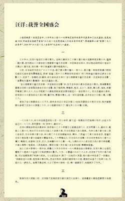 汪洋的原始学历也只是初中,但在他的艺术生平简介上却是这样写的:汪洋号黄山人,副教授,高级工艺美术师,任教于景德镇陶瓷职工大学美术系,景德镇老年大学国画系。为中国美术家协会江西分会会员,景德镇美术家协会、中国画艺术委员会副秘书长、理事,江西省工艺美术学会会员,首届景德镇市青年美术家协会副主席兼秘书长。艺术传略编入《景德镇陶瓷全集》《景德镇中青年陶艺家作品博览》等画册,出版有《汪洋、汪洲、汪尚模陶瓷作品集》一书。国画陶瓷作品多次在国内外获奖和收藏,并被上海东方电视台、江西电视台、《新民晚报》《文汇报》《企业文化报》等媒体报道。加上近年来获得的一些荣誉,和最近作为景德镇唯一的代表参加全国青联会,汪洋的身上让我们看到了与启功大师自我写照有点类似的影子。作为一名普通的陶瓷艺术人士,汪洋有了今天的系列成就,可以说是取得了初步的成功。每每谈及此事,除了一脸灿烂的笑容,他的眼神中还多了一份凝重:“回顾走过的路程,我觉得非常顺利。在这顺利中,我得感谢所有的朋友,是他们从各个方位和方向,为我的每一步出力。如果不是这样,或少了其中的任何一位,哪一脚踩空了,也就到不了今天。”