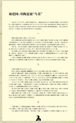 “景德大帝”让“景漂”的谢建国走进了人们的视野。而几乎与这一雕塑构思的同步,他已开始了用陶瓷做“鸟巢”的设想。“‘鸟巢’是世界十大名建筑之首,更是2008北京奥运的标志性建筑,如果用陶瓷来做一个,无疑是借奥运宣传景德镇的大好机会。”