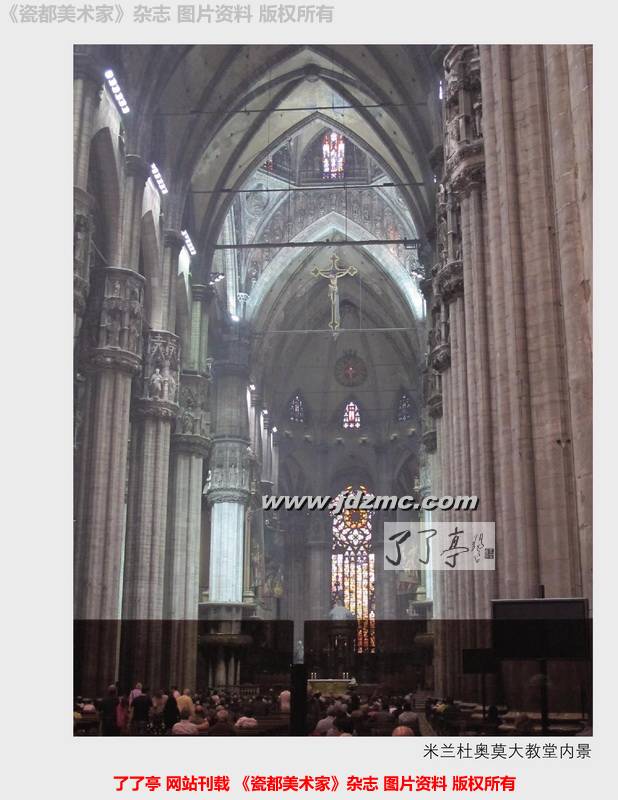 这里是神圣之所。脱帽进入大教堂的那一刻,我却还没有相应的心理准备,无法描述当时的内心感受。教堂空间之巨大是令人超乎想像的,数万人涌动,却井然有序。整个建筑几乎没有墙壁,只见一组组修长的立柱支撑着一层层轻盈通透的飞扶壁券,骨架之间是一个个又高又大用彩色玻璃镶嵌的花窗。教堂内装饰很少,骨架结构赤裸裸地袒露无遗,由立柱组成的垂直线条和矢状尖券使教堂的空间既高耸又明亮,阳光从众多彩色玻璃窗直射而下,五彩斑驳,相互交映。人们沐浴在彩色的光束之中,心醉神迷,如同进入童话世界,油然产生一种忘却人生的苦难,腾空而起,飞升神秘天国幻境的强烈宗教感,真实地反映了基督教建筑艺术所能传达给我们的内心体验,以及突显出中世纪城市发展的物质文化面貌。可以说,一种艺术,总能反映一种精神,它的形成与自身的泥土血脉相联,与孕育它的社会环境、文化背景相统一。美国历史学家房龙说:“基督教在诋毁艺术之后,又创造艺术。”在中世纪千年黑暗中,哥特式建筑具有高度的艺术性和工程技术上的高难度,二者的结合最终达到了人类历史上的惊人成就。这些佚名的巧匠,是身怀绝技秘宝的建筑大师。米兰杜奥莫大教堂始建于公元1368年,经过500多年的陆续修建才竣工。建筑物上尖塔林立,达135个之多,塔尖最高 处立有4.2 米高的圣母雕像。同时,教堂外壁装饰有3159座雕刻,整个建筑绚丽优雅,精巧明快,其宏大的规模成为欧洲哥特式建筑艺术之典范是名符其实的。