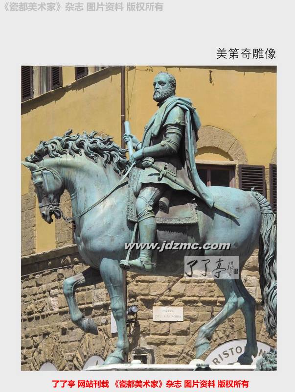 瑞士高原挡住了大西洋吹拂的季风,在意大利中部,和煦的阳光照耀着古朴的佛罗伦萨。我急切地行走在古老的街巷中,心里默念着达·芬奇、米开朗基罗、拉斐尔的英名,我朝圣来了。翻译说:“米兰、佛罗伦萨和罗马均是联合国列入的历史文化名城。城中是不允许搞新的建筑或改变它的原貌的。所以600 年前这里是怎么样,今天仍然怎么样。”是的,目睹这一处处古老的建筑,一座座精美的雕刻,我们真切地感受到这里浓厚的历史氛围,体悟着文艺复兴发祥之地生动的文化气息。在陈列着诸多雕刻作品的市政广场上,首先映入视线的是罗伦佐·美第奇高大的骑马铜像。美第奇是中世纪佛罗伦萨的著名家族,欧洲最大银行家,参予佛罗伦萨共和国政府,1434年后长期建立僭主政治。其族人先后受封公爵、大公,当选为罗马教皇。美第奇家族酷爱艺术,提倡文艺,具有高雅的趣味和鉴赏能力,数百年间充当艺术经纪人和保护者的角色。在罗伦佐·美第奇当政时期,佛罗伦萨成为文艺复兴的中心地,这必定有其深刻的政治、经济背景。但在艺术的表现上,以人文主义思想为主导,用科学方法探索人体的造型规律,把中世纪平面装饰之风改变为透视法则,表现明暗效果,表达三维空间的新画法就是一大进步,这对欧洲绘画特征的形成和发展奠定了基础。在以神话内容为题材的创作中,将抽象的神话刻画成合乎世俗化的理想人物,让人物画走下神坛,这就创造了人物画的新风貌,从而改变了欧洲中世纪的绘画模式。在广场一侧的美第奇宫如今已成了美术馆,无数的大理石雕刻、壁画、天顶画等艺术珍宝,让我们叹为观止,真实见证了文艺复兴时期的辉煌。但是文艺复兴绝不仅仅局限在绘画、雕刻范围内,在人文主义思潮引导下,文艺复兴运动扩大至了全欧洲大陆,反对中世纪禁欲主义宗教观,摆脱教会对于人们思想的束缚,扫除作为神学和经院哲学为基础的权威已成时代风云。这就必然引起强烈的社会变革,使得自然科学、文学戏剧、音乐舞蹈、建筑艺术诸领域都涌现出时代的杰出人物并取得了划时代的成就。