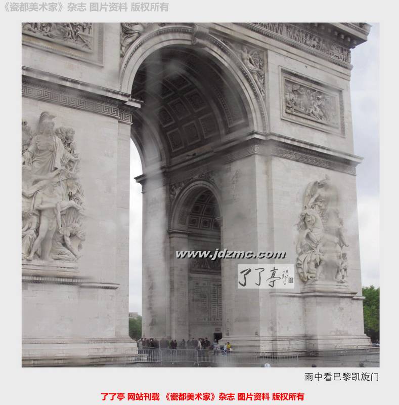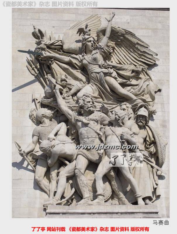 香榭丽舍大街的星形广场中央,座落着一座模仿古罗马城君士坦丁凯旋门的纪念性建筑:巴黎凯旋门。是为拿破仑一世敇命而建,其规模之大为今世居首。门的上端饰有六块浮雕,描写历次重大战役,东西两侧有四块《出发》《归还》《保卫》《和平》的巨型浮雕,为雄伟的凯旋门增添了光彩。雕塑家将拿破仑塑造成裸体的古代英雄,将他的妹妹波琳娜·波尔盖丝表现成半裸的维纳斯样子。《出发》的作者呂特,是位充满古典主义与浪漫主义精神的著名雕刻家,他的这件作品又名《马赛曲》,表现的是1792 年奥地利武装干涉法国革命时,马赛人民起而反抗的爱国行为。作品所显示的艺术效果与著名的浪漫主义画家德拉克洛瓦的油画杰作《自由在引导人民前进》有异曲同工之妙。作品以完美的构图,优美的节奏,鲜明的主题打动着每一个欣赏它的观者。