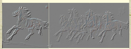 我看到这位写实人物画高手所画的很多马,基本都是四蹄不呈对角,常出现一边蹄子平齐离地较近,另一边蹄子平齐离地面较高地跳“单边舞”。我还看到过一幅他画的八匹马。这八匹马似乎是在做一种集体混合操———四匹马右前后脚近地、左前后脚离地前后拉开;另四匹马前两脚跃起、后两脚不明。两种姿势几乎相同,变化只在于高低不齐。除此之外,我们还知道马蹄要钉马蹄铁,也听说过古战场上马穿甲胄,但从未听说过马膝关节安装什么,这位老先生画的马所有前膝关节转弯处都非常生硬,似乎安装了一个铁套。