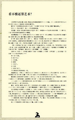 看过一档节目,韩美林批评现在艺术界有很多人用铁丝随便一扭,或者整个钢球上去,就说是艺术作品,问作品有什么含意,答“艺术是不需要解释的”,韩美林质问:艺术怎么不需要解释呢?这让我想起小时候常玩的过家家,搞一点田泥,如果玩久了里面水分不够可塑性下降,便撒上一泡尿,然后胡乱地捏出一些自认为是家庭所需的东西。很可惜,这些东西未能保存,不然也可以办个艺术展。想知道有什么艺术内涵和美感?告诉你:艺术是仁者见仁智者见智的!艺术是不需要解释的。而且,我用的是当地特有的田泥,撒的童子尿不多不少,里面还融入了我难能可贵的童真!