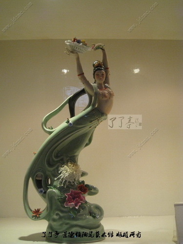 瓷器上,除有“天女散花”的纹饰外,还有各种造型的天女散花瓷雕。景德镇广受赞誉的天女散花瓷雕,见有两尊:一为曾龙升、曾山东父子作。1959 年烧造。高1.34 米。取材于佛经故事。天女眉清目秀,立在云中向人间散花,衣饰迎风飞舞。底座塑成云团,像在天上飘移。现陈列在北京人民大会堂江西厅内。