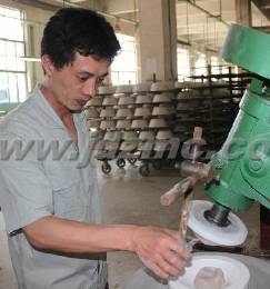 交谈中解到,他不但掌握了陶瓷成型的许多高难操作技能,还积极参与厂新产品开发工作。据不完全统计,他与同行们合作开发新产品达300余件。在长期的工作实践中,他还与厂里的技术人员一起攻克了一个又一个技术难关,并多次独立解决异型产品的技术难题。当问及哪次印象最深时?他沉思了一会,便拿出一个水果拼盘样品,道出了2008 年为国庆60 周年庆典专用瓷生产订单的经历。当时定制的庆典瓷是一套水果拼盘,可试制过程中发现盘子与底座合缝粘接不稳定,造成产品质量合格率不高,为了解决这一技术难题,他每天工作十几个小时是家常便饭。在试制产品过程中,他突破常规,大胆采用了二次成型、二次烧成相结合的办法,经过一个多月的反复调试、试烧,最终有效地解决了因受高温烧成而易产生变形问题,使该产品质量合格率提高到60%以上。时间虽然过去了4 年,但他看着样品时脸上露出的笑容是那么欣慰,他说:.当时第一念头就是一定要攻下这一技术难关,让公司能够早日顺利接下订单。.