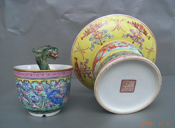 九龙公道杯又叫平心杯,分杯体和杯座两部分,通体高约20厘米。在白腻的瓷面上,有青花钴料工笔描绘的八条姿态各异的五爪龙,连同杯中的一条雕刻的龙,共有九条,九条五爪龙,寓示皇帝“九五之尊”的威严。更神秘的是,杯中央的瓷龙颈部有一黑色的圆点,当酒水低于圆点时,一切正常,当水面超过黑点时,杯中酒水很快就流出杯外。这是因为瓷龙要侧与杯底衔接处有一约3毫米见方的小孔,在杯外底中心也有一直径3猿毫米的小孔,当往杯中注水超过黑点时,水便从杯内底小孔进去,又顺着外底的小孔流了出去,这其实就是虹吸现象的作用。究其原因是,液体从较高处通过一条拱起弯管,先向上再向下流到较低之处,其因弯管要呈倒U字形且一端较长,使用时管内必须先充满液体。公道杯里外的两孔之间由弯管相连,外部一端较内底一端长而瓷龙所标黑色圆点的位置即弯管最上端的部分。当杯中水低于或平齐于黑点时,水不能漫过弯管而泄流曰当水超过黑点时,水面高出弯管产生压力,于是通过虹吸而使水顺着弯管流到杯外,直至流净。是一件集工艺性、知识性、趣味性和审美性于一器、欣赏与收藏并重的特色瓷。 九龙公道杯明代永乐年间景德镇御器厂均有出品,现在景德镇仍有生产。福建德化窑制品较为多见,但其杯内瓷雕造型一般以寿星人物为主。 |
