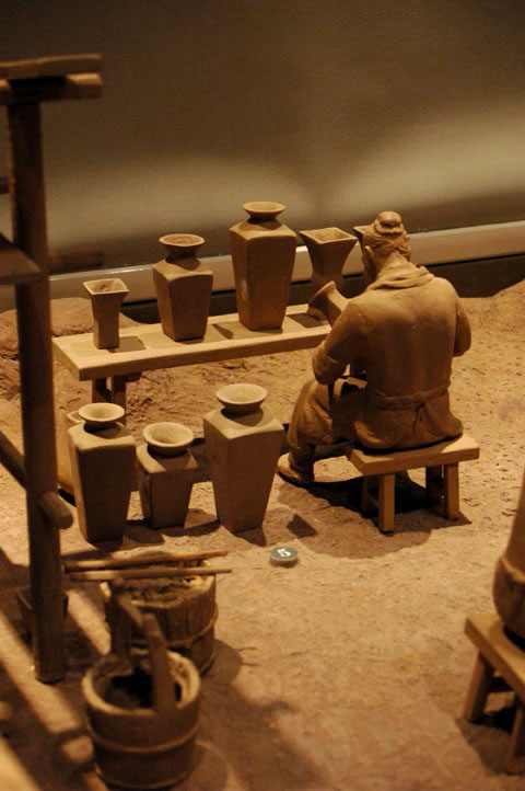 琢器做坯的程序与园器差不多。只是园器多为小件之类的碗、盘、碟日用瓷之类,而琢器则以瓶、罐、尊等陈设瓷为主。故此,两者做坯手法显然不同。琢器做坯工上车先搅车、放车、打好码脚,裁死托坯饼子。做坯时双手枕在大腿上,用劲把泥古捧起扔在饼子中央,挤泥肩再按下,这叫“闭泥”,闭泥的目的是管死泥性,避免坯体起泡和揉软泥古。闭死一个泥古再加另一个,反复挤肩闭泥后,开始打腕子、摸平底。琢器做坯整个右手都必须插入泥古分开泥盘扯泥堂,直至五指撮插到底(做小件坯时用仰手、大件坯用扑手),再弯曲手指跪在泥中间缓缓扯开,由下而上,一手在坯内,一手在坯外,以右手指节对准坯外左手巴掌,慢慢拉开坯口,这叫“操堂”,操到坯体形成所需的器型后松手,蘸上清水,用双指放在泥口上整口,以便接坯。 |