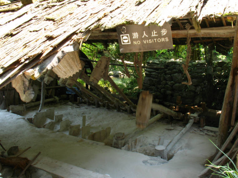 历来碓工以碓棚为单位,一人管一棚,分散作业,碓工们每天早晚需要换两次碓。换碓时,先将碓支高高挂起,然后将舂碎的矿石粉舀起,倒入浆池制浆。淘浆时,用长柄葫芦瓢不停地在浆池内搅动,待到浆水混浊时,用瓢将泥浆舀入流浆沟,泥浆沿着细长的流浆沟缓缓流入储浆池,进行沉浆。在沉浆中,碓工还要连续几天不断地用泥靶子淘洗,弃去池中粗渣,待到沉淀后放掉池上清水,就可以取到已经稠化浓缩的瓷泥浆了。