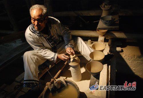 拉坯成型:借助手工技艺把固态瓷泥拉制成坯胎的方式叫做“拉坯成型”,有的坯胎是一次拉成;有的坯胎需要分段拉制,然后用泥浆镶接成型。