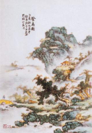 (注:汪野亭的山水在技法上具有别开生面的生动性,但在山水构图上仍以参临名家画稿为主,这时彩绘山水瓷人普遍的瓶颈,缺乏游历名山大川的生活经历和写生创作实践)。