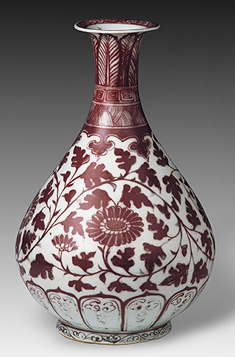釉里红瓷器,是在宋代钧窑窑变釉基础上发展而来的,是指用铜的氧化物(铜花)为着色剂配制的彩料,在坯体上(或先施以青白釉的坯胎土上)描绘纹样,再盖一层青白釉,然后装匣入窑,在高温中烧制使其呈现出娇妍而沉着的红色。釉里红瓷器有三种不同的装饰方法:一是釉里红线绘,二是釉里红拔白,三是釉里红涂绘。涂绘釉里红,是在塑成的立体器形上用铜原料涂绘出图案花纹。在瓷胎上绘制的图案,要远比刻画、堆塑随意得多,表现也更具有穿透力。古时,对外贸易中常见的器物以碗、罐居多。瓶、罐之类的瓷器,都有接胎的痕迹。装饰图案最常见的有缠枝莲、缠枝牡丹等。