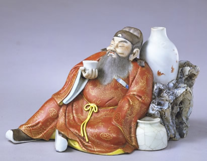 自古以来,钟馗多以狰狞可怖的面目示人,常手持利剑,捉拿妖魔鬼怪。后来,钟馗逐渐演变成为迎富、纳福的吉祥神人。此瓷像的塑造风格与传统的钟馗形象不同,更富有生活气息和人情味,其醉态使人觉得和蔼可亲,诙谐可爱。彩瓷中的塑像以三彩居多,粉彩少见,钟馗像更为稀有,此件为康熙彩瓷中的珍品。