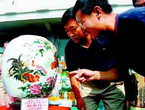 2005年7月19日“沈阳晚报”报道“景德镇陶瓷在沈展出天价瓷瓶”于沈阳东陵区南塔街101号宏伟新都外广场景德镇陶瓷展销会,画鸡大王俞金喜耗时一个半月的力作。