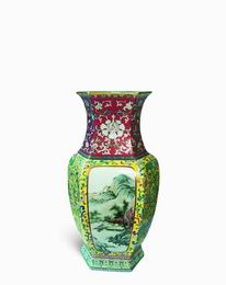 | 备 注: | 作品赏析 此件民国时期的粉彩山水六方瓶,敞口,束颈广腹,撇足,颈部饰红地缠枝莲纹,肩以回文一周为界,器身开光绘山水图景,笔法传统,布局符合规制,设色宁静淡远,并以黄地缠枝莲纹通饰器身。此器制作规整,器形古朴端庄,具有乾隆时期清宫陈设的精美典雅之风,为民国的仿古之作。 | ||