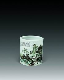 | 备 注: | 年代:1946年(丙戌) 作品赏析 汪小亭绘瓷画极有个性,喜用秃笔,技法娴熟,下笔随心。此件笔筒笔力厚实雄健,洒脱奔放,作奇山异石,意境苍润。尤其是“风雨过小桥”之景,极富生活气息和诗的意境。更值一提的是,笔筒背面还有仿古陶板铭文一篇,写得极古拙有味,可玩可赏,当是作者特别经心的佳作。笔筒胎质润白,略略束腰,雅致稳重堪为文房清供也。 作者简介 汪小亭(1906-1970),年少时随其父汪野亭学画,有“八小名家”之称。擅画山水,常以秃笔作画,笔力厚实雄健,洒脱奔放。 | ||